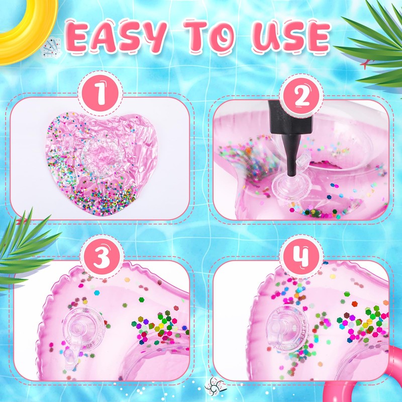 - Durable and Reusable: the heart inflatable floaties cup is made of quality PVC material, which is non-toxic and durable, novel and beautiful, of good quality, not easy to tear or break, with a smooth surface, good hand feel, and can be used for a long time. These cup holders will not leak easily after being inflated. There are colorful sequins inside(It is recommended to gently pat or rub the surface after inflation until the sequins are scattered around the inner wall)