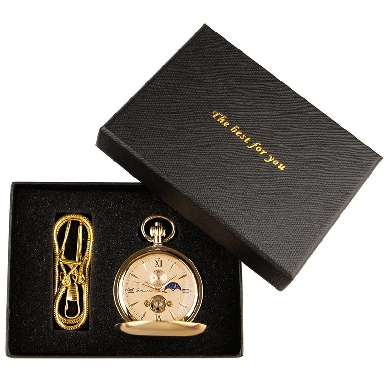 - 【Come with gift box】:Package includes-1 x Pocket Watch,-1 x Chain,-1 x microfiber cloth,1 x operating instructions, 1 x black gift box.Come with pocket watch box. Perfect gift for your love and family or yourself.This stylish pocket watch deserves a place in your consideration.