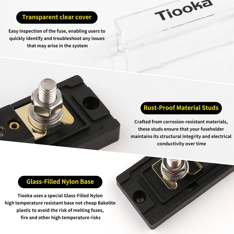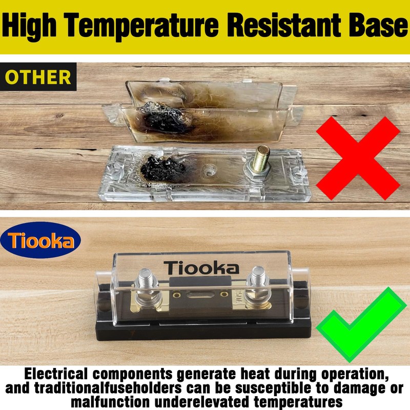 - 【High Quality and resistant to extremely high temperatures】Crafted from Glass-Filled Nylon Base and brass copper materials, Tiooka ANL fuse, with an ANL fuse holder and fuse block, boasts durability and reliability. The clear protective non-conductive resistant cover ensures easy custom installation, making it a valuable addition to your solar system