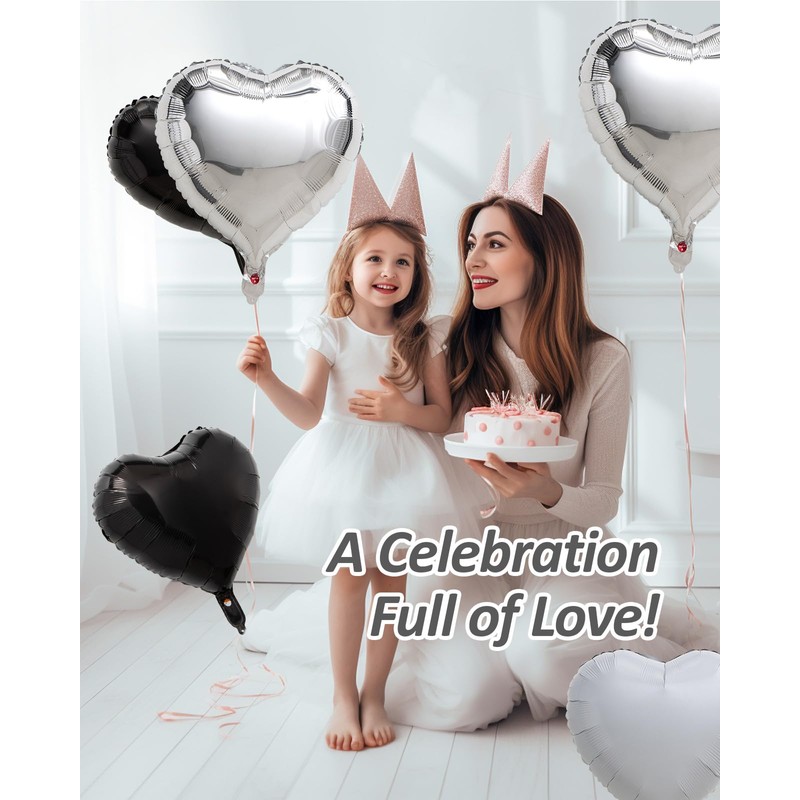 TIPKITS 15 PCS Black Heart Balloons, 18 Inch White Heart Shaped Balloons Foil with Ribbon, Silver Heart Foil Balloons for Baby Shower, Birthday, Party, Valentines Day Decorations