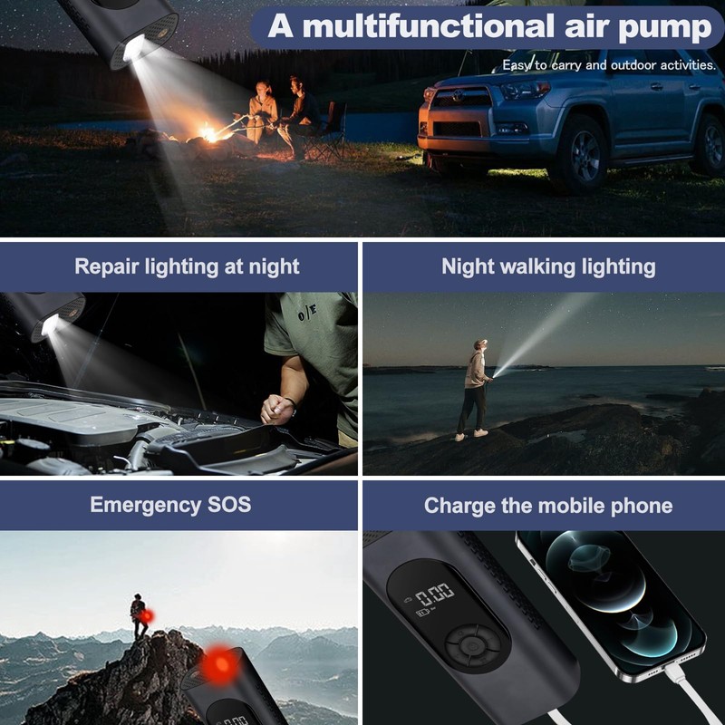 Tire Inflator Portable Air Compressor for Car/Motorcycle/Bicycle Tires 150psi tire pressure Tire pressure measurement 5 conversion valves 50cm air tube SOS/LED