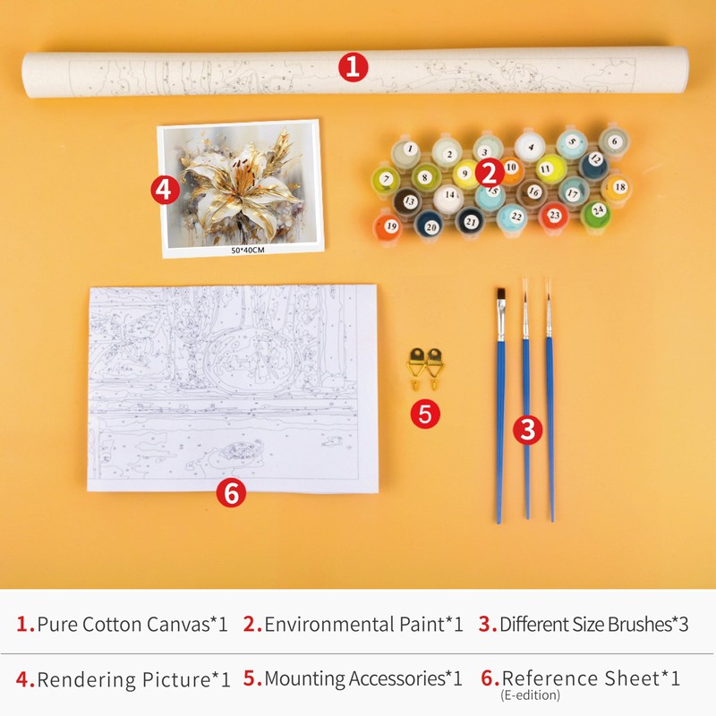 - Package Include: Paint by numbers kits includes a 16'' x 20'' canvas (frameless), 3 nylon brushes, a complete set of acrylic paints, a reference sheet and a sample oil painting.