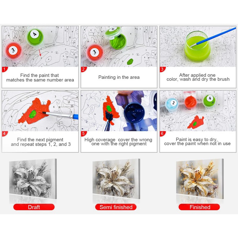 - Easy To Be A Painter: Paintings are simple and easy to draw, not complicated, and can be easily handled by children, adults, and the elderly. Two easy steps to complete a painting, first: dip the paint. Second: paint the corresponding numbers on the canvas.