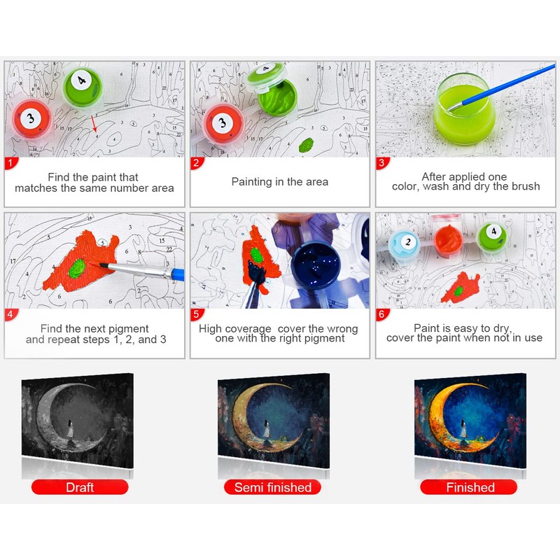 - How to paint: You only need to match the numbers of the paint and the figures on the canvas to fill the colour. Then choose the right size brush to paint and finish the painting step by step.