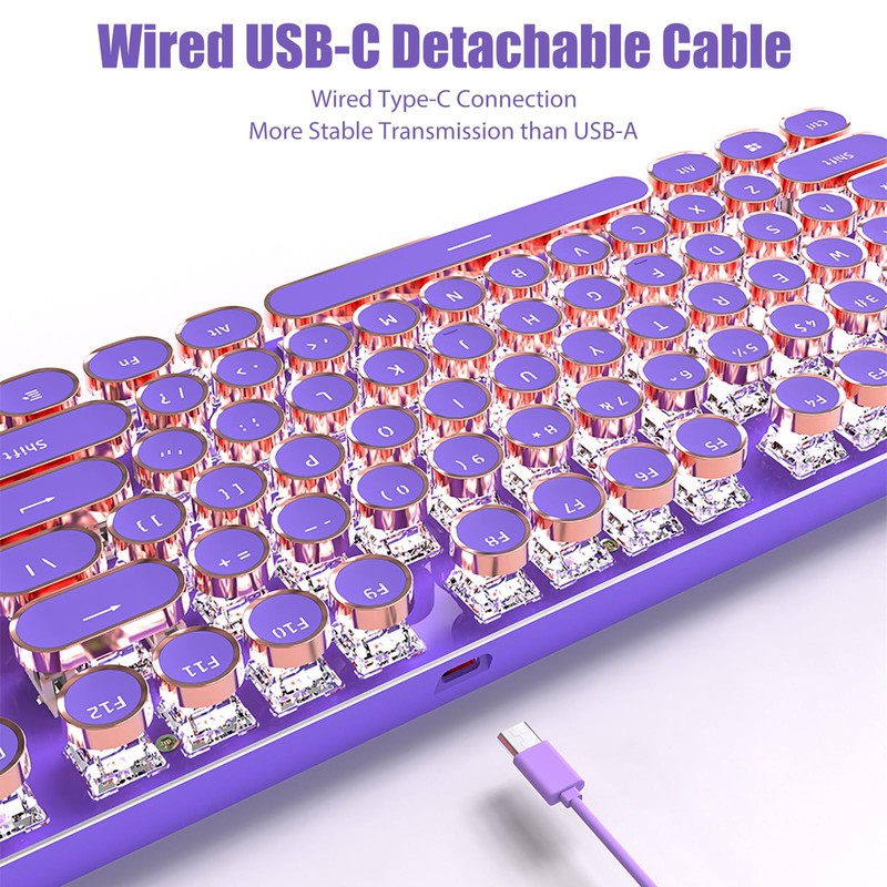 TISHLED Typewriter Style Mechanical Gaming Keyboard White LED Backlit 104-Key NKRO Pink Switches Retro Round Keycaps Golden Ring Volume Knob Metal Panel Wired USB-C Detachable Cable, Purple