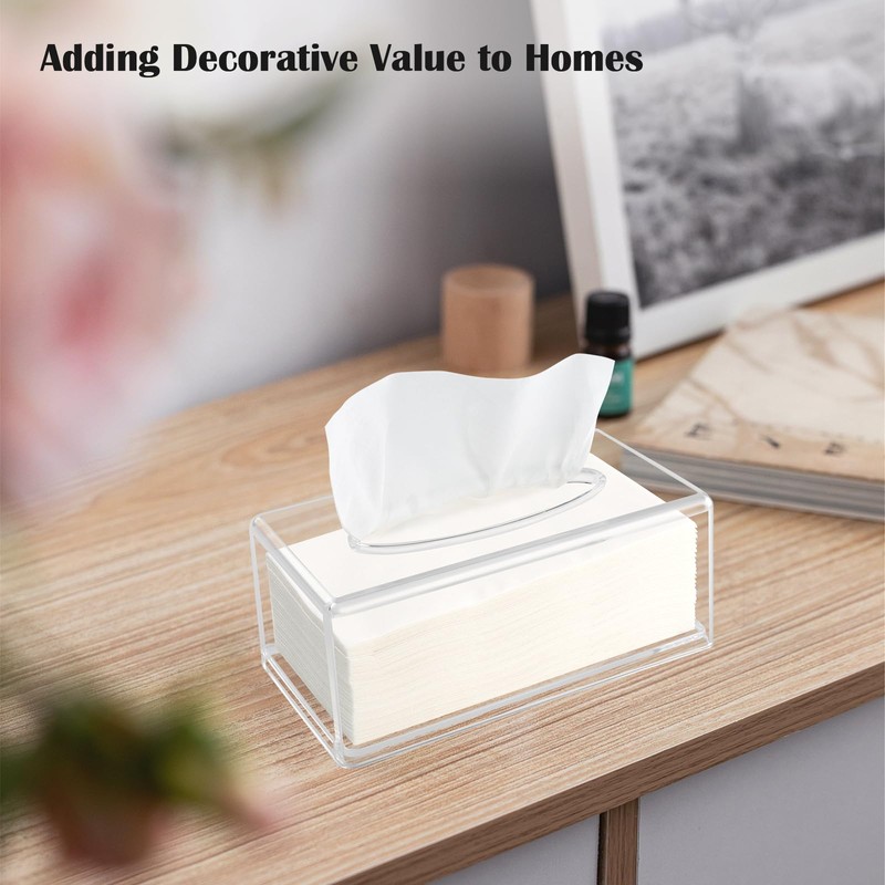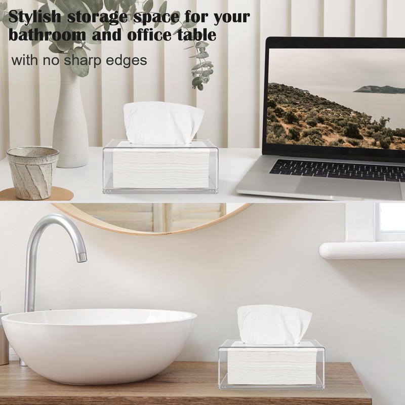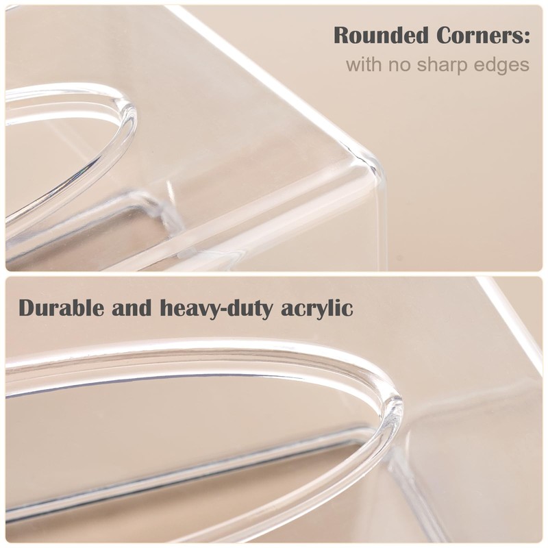 - Crafted with high-quality acrylic, this tissue box cover offers a sturdy and smooth touch. The round corners design ensures no sharp edges, providing both safety and style, offering a stylish and perfect solution for your everyday needs, and say goodbye to unsightly cardboard tissue boxes. Measuring at 5.5x5.5x5.5 inches, this square box fits perfectly in any space. Enjoy the convenience and elegance of our Acrylic Tissue Box, bringing a touch of modernity to your everyday essentials.