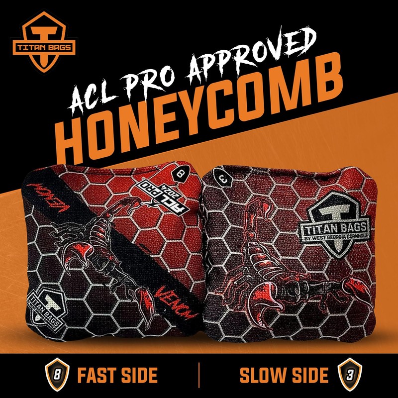 Titan Bags Venom Cornhole Bags - ACL PRO Approved Cornhole Bean Bags for Tournaments, Versatile & Durable Regulation Cornhole Bags Ideal for Indoor/Outdoor Toss Games - Honeycomb, Death Red (4 Pack)