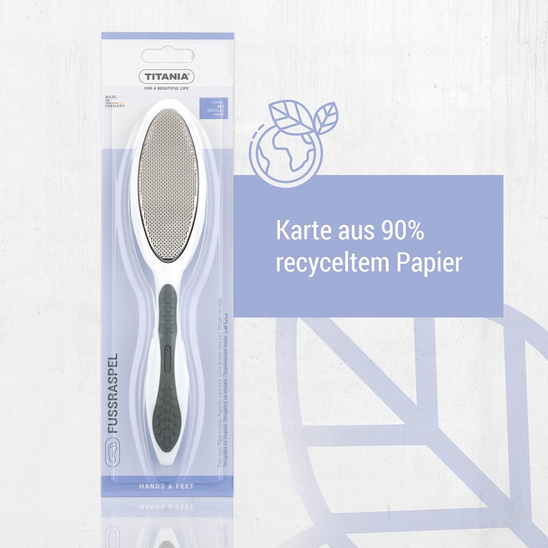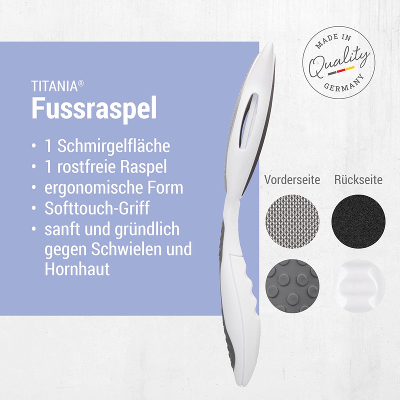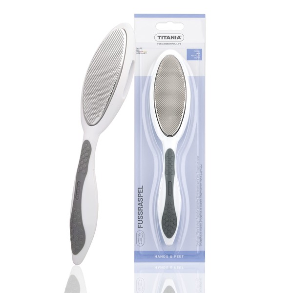 • Callus rasp for beautiful feet – the ergonomically shaped TITANIA foot rasp with soft-touch handle ensures skin-friendly foot care with its emery surface and the rust-proof rasp by gently and thoroughly removing calluses and calluses. The combination of the fine emery surface and the coarse rasp side leaves particularly soft and gentle feet after application.