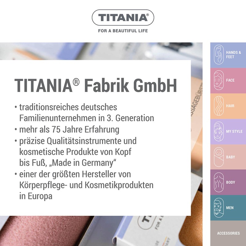 • Traditional German family company – for over 75 years, TITANIA Fabrik GmbH, based in Wülfrath, has been one of the largest manufacturers of personal care and cosmetic products in Europe. TITANIA stands for the highest quality and competence "Made in Germany". Our goal is that everyone feels comfortable in their skin - whether young or old. TITANIA - For a beautiful life!