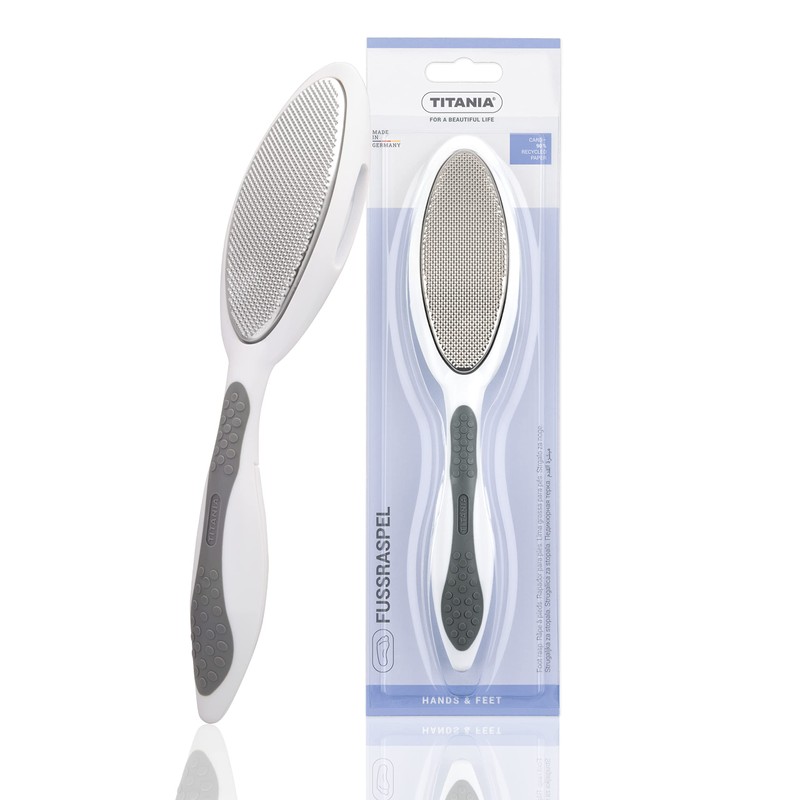 • Ergonomic handle - Experience maximum comfort and ease of use with the TITANIA soft-touch foot rasp. The ergonomically designed handle with soft and non-slip "soft touch" finish provides a warm, comfortable and stable grip surface that fits perfectly in the hand. This increases the feel-good factor and facilitates application for a thorough pedicure.