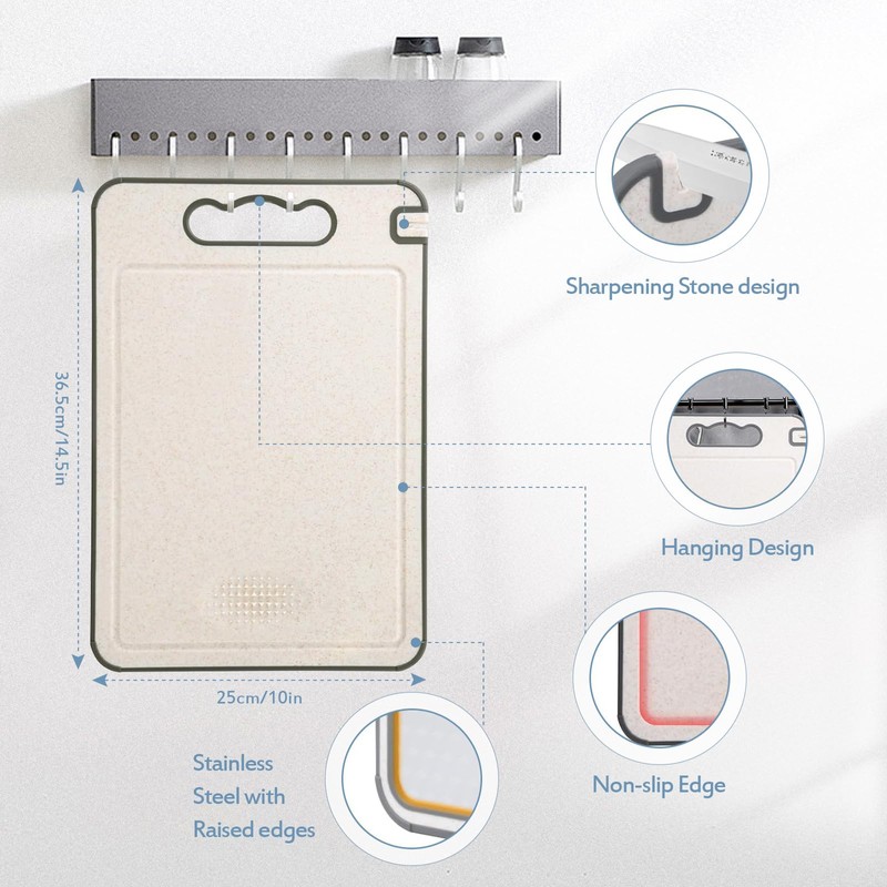 - 【Dual-Sided Titanium & Wheat Straw + PP Design】 This cutting board features a unique dual-sided design: one side is made of premium titanium for heavy-duty tasks, while the other side combines wheat straw and PP material, perfect for delicate fruits and vegetables