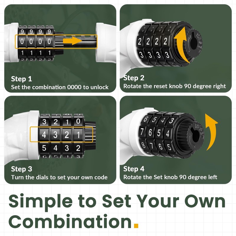 - Resettable combination bike lock: Smart 4-digit resettable coiling lock, easy to set your own personalized combinations. As a kind of combination lock, it saves you a lots of unnecessary troubles, like carrying the keys all the time.