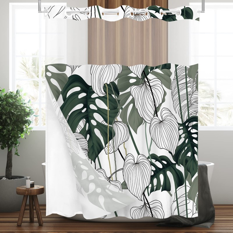 Tititex No Hooks Snap in Liner Tropical Botanical Palm Leaves Shower Curtain Sets, Hotel Luxury Double Layers Waterproof Fabric & See-Through Top Window Bathroom Decorative 72x72 Inch