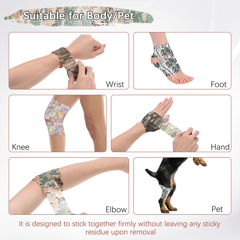 Highly Elasticity Material-Each roll of our Camouflage Self-adhesive Form Tape is 2.0 inches x 14.76 feet, stretching up to 4.92 yards. Made from soft, breathable non-woven elastic fabric, it is kind for all skin types.Fit for wrapping over gauze on wrists, fingers, ankles, other body parts and pet parts.