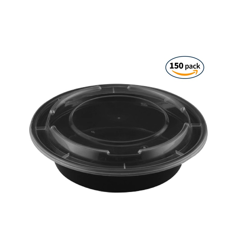- SPECIFICATIONS: These 32 oz containers use food grade bpa free plastic for the body and lids. Our material is oil and water resistant with no leeching or unsightly stains. These circular bowls come in a 150 pack to give you a better deal for bulk meal prepping and restaurant to-go service.