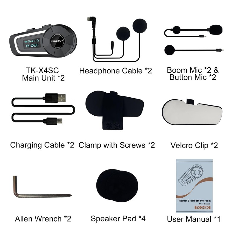 - 【LCD Display & Exchangeable Microphone】The TK-X4SC intercom is equipped with a LCD screen that shows all the information you need, including battery capacity, current mode, current status, FM channel, etc., so you don't worry about any complicated operation issues. It has two interchangeable microphones - allows you the choice between a boom microphone for open face or flip-face (convertible) helmets, or a button microphone for full face helmets.