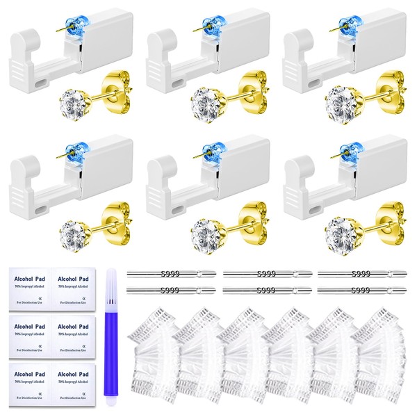 - PACKAGE INCLUDES: You will receive a 31 pcs professional piercing kit, including 6 pcs disposable ear piercing guns, 6 pcs premium cubic zirconia earrings studs (3/4/5mm), 6 pcs S999 silver ear sticks, 6 pcs waterproof ear covers, 6 pcs cleaning pads, 1 pcs marker pen. Providing you with everything you need for a perfect piercing every time, whether you're a beginner or a professional