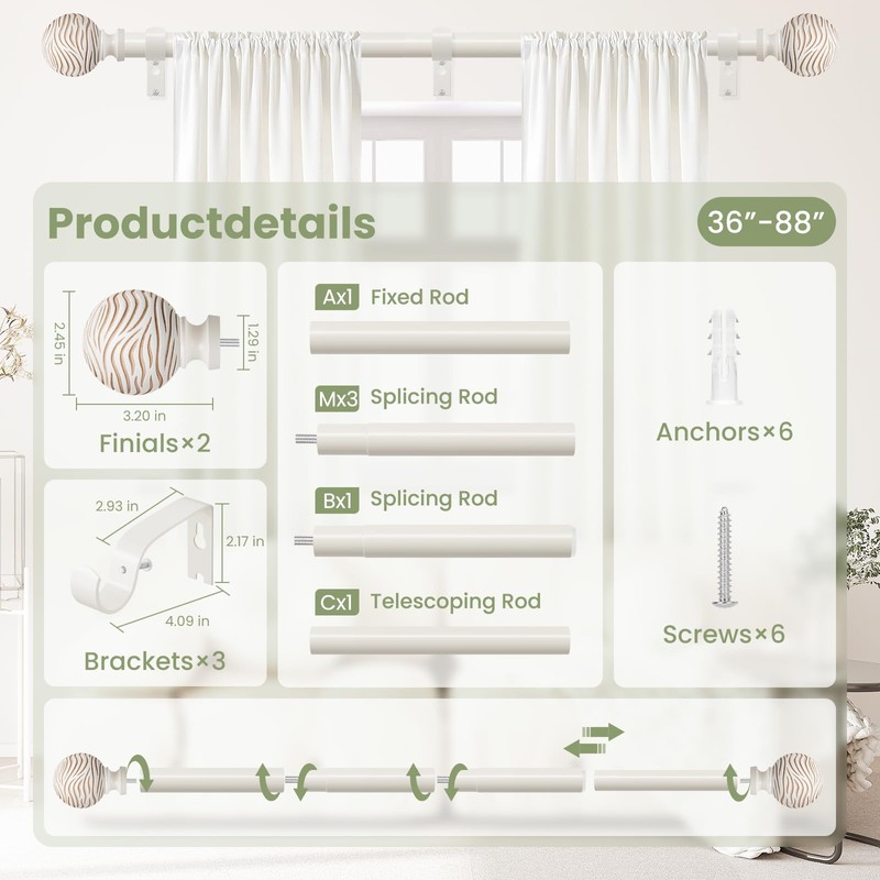 - Easy Install White Curtain Rods:Faux wood adjustable curtain rods feature a telescoping and splicing construction that adapts to size of window by increasing or decreasing number of fixed rod and adjusting length of telescoping rod end.(Need to overlap 2-3inch when telescoping to maintain boho curtain rod stability)Each set of modern metal curtain rods comes installation steps and allaccessories needed.Follow instructions step-by-step,install farmhouse natural wood curtain rod in just 15minutes