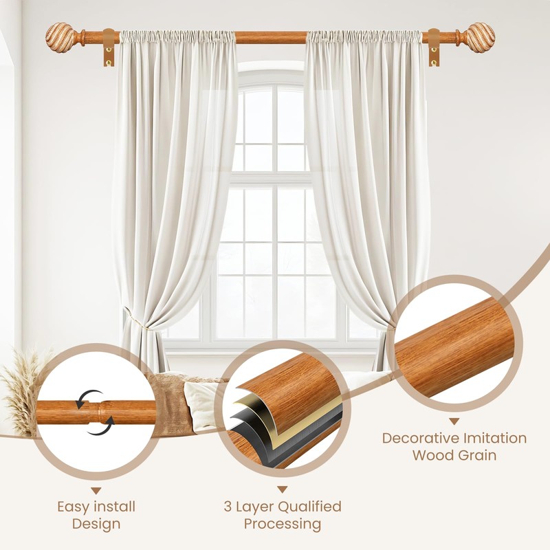 - TKZTKZ Decorative Wood Curtain Rods:Design of wooden curtain rods for windows is close to natural wood.Brown boho farmhouse wood grain carved window rods for curtains is easy to integrate into various window treatment hardware decoration.Wood curtain rods with faux wood unique finials,simple but elegant,bamboo curtain rods can be adapted to various styles of curtains.Whether it's simple modern,romantic rustic,retro european,bohemian style,decorative wooden curtain rods can be a perfect fit