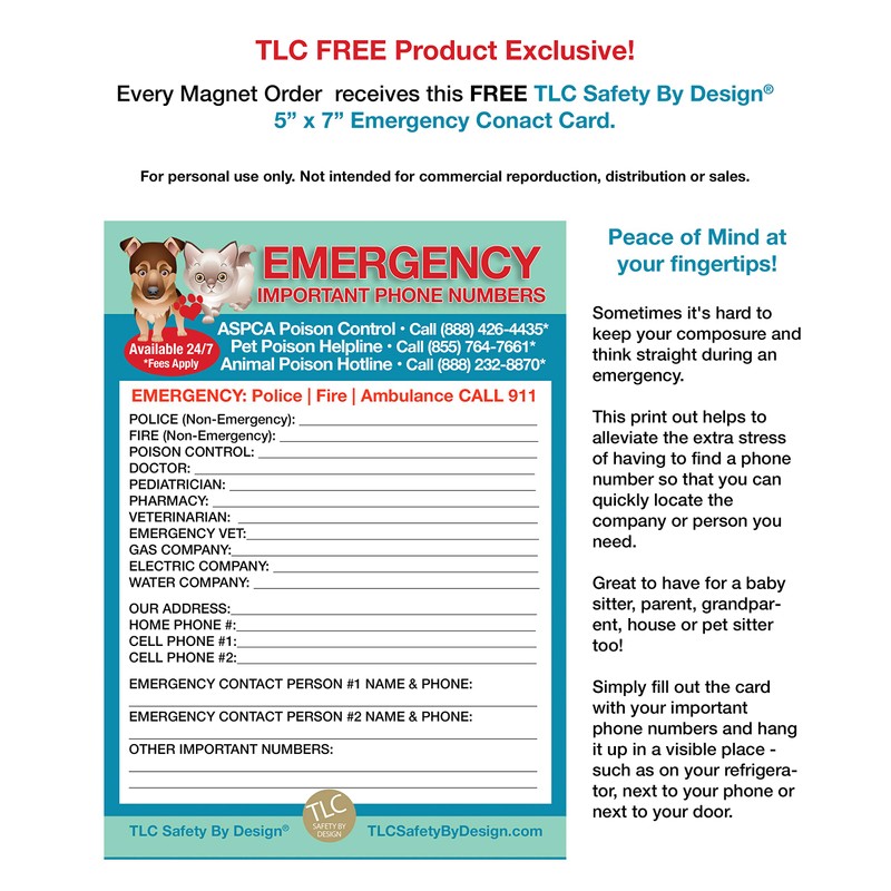 - EVERY ORDER INCLUDES A MATCHING FREE 5” X 7” EMERGENCY CONTACT CARD. Post this list on your fridge or another visible location so that you can quickly locate the company or person you need. Great to have for a babysitter, parent, grandparent, college dorm room, first apartment, house/pet sitter!