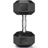 The rubber coated cast iron hex dumbbell is made from solid cast iron and includes a rubber coating on each end of the weight.