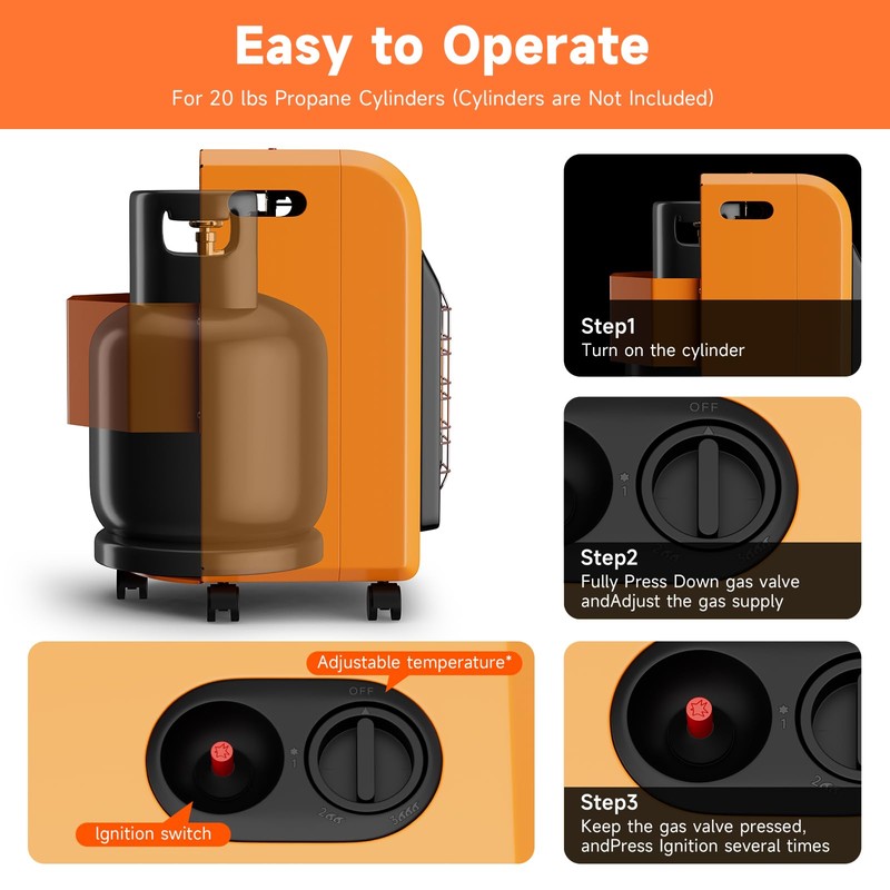 - Easy to Use - The single control start knob allows the reliability of the easy-to-use piezoelectric spark mechanism with automatic safety shut-off in case the portable outdoor heater garage heater topps over.