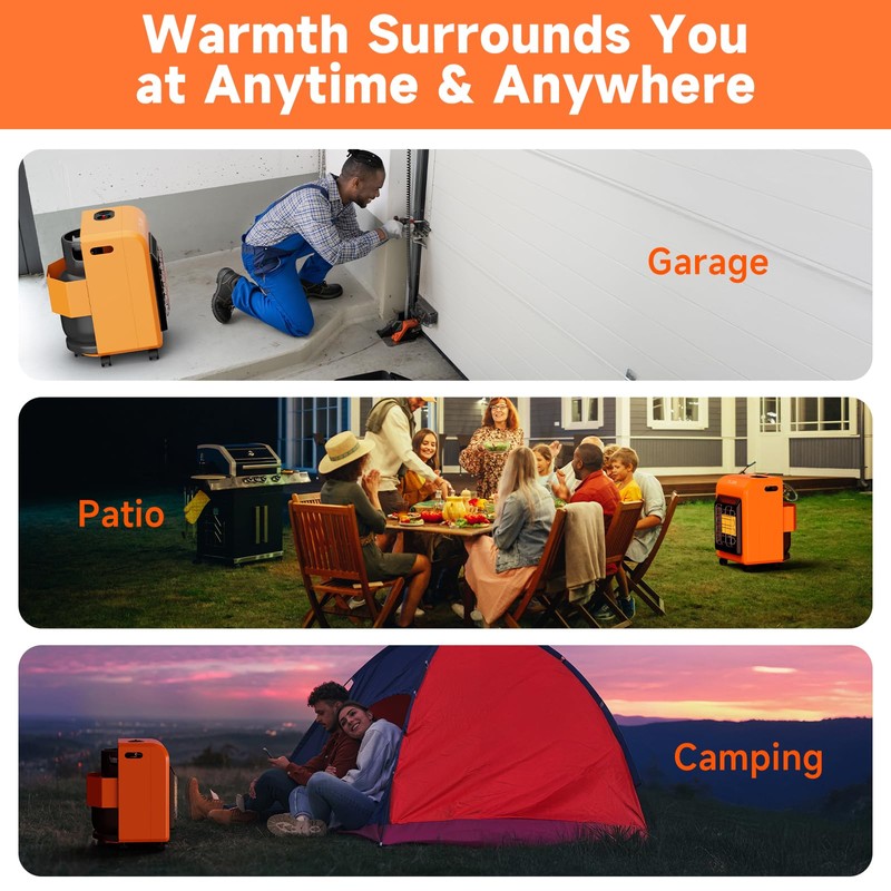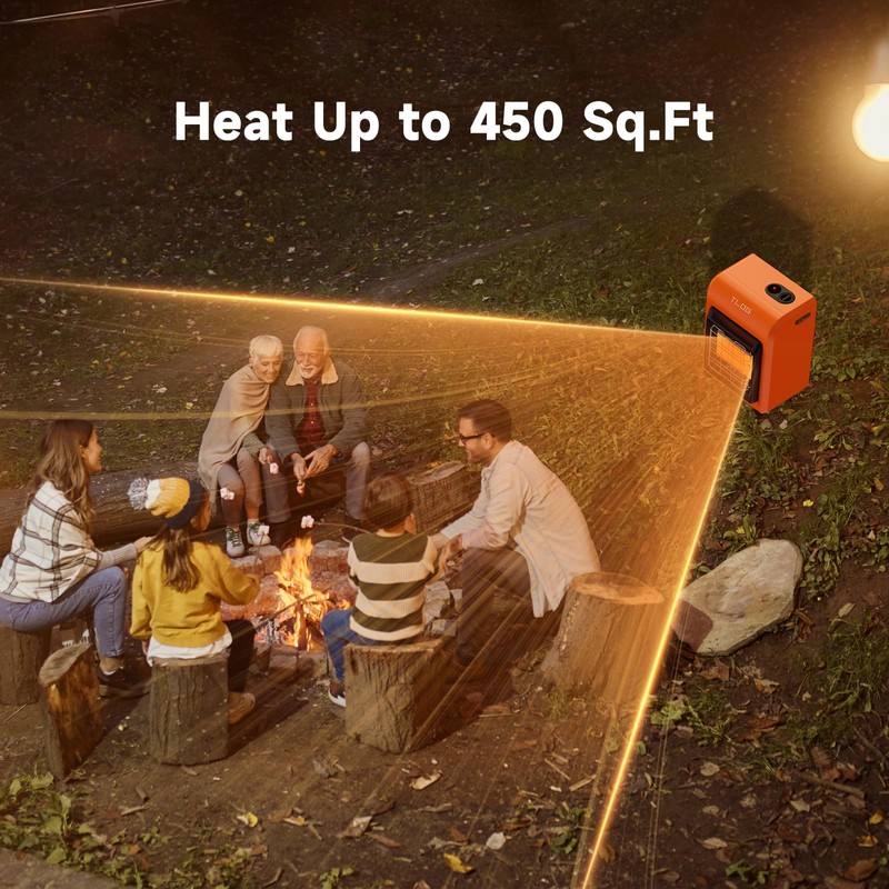 - Heats up to 450 sq. Ft & Quiet - TLOG propane heaters heat up to 450 square feet. The noise level does not exceed 32dB, providing you with a quiet, warm and comfortable environment to work, read and relax. Perfect for camping or picnic areas, porches, sheds, garages, construction sites, patios, backyards.