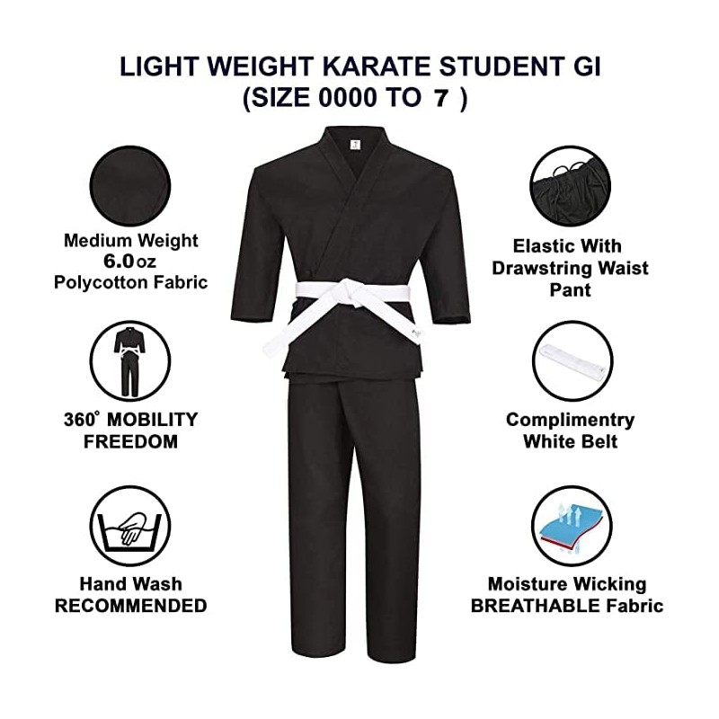 Product description: Please follow the size chart to find your right size, If you fall in between 2 sizes or on the border of a size consider buying 1 size up or feel free to ask a question if you still can't decide Our lightweight karate uniform is made of high-quality breathable polyester cotton which will prevent excessive perspiration and keeps body comfortable while eliminating sweating. Fiber content 55% cotton and 45% polyester. Fabric weight is 6oz per square yard or 6.5oz per meter, (3% tolerance level) Although this suit is designed for karate but may be used to practice multiple Martial Arts systems such as Teakwondo Cross over style jacket is also used in some Taekwondo classes (please consult your instructor) During training the uniform makes the practitioner feeling comfortable, meeting the requirements of Traditional Karate practicing. An ideal set for entry level students It is made of high-quality poly cotton which will prevent excessive perspiration and keeps body comfortable The karate clothing is sweat-absorbent and comfortable to wear and it is the best choice for many karate enthusiasts. No logo plain gi which allows school owners to customize it with their emblem or logo. Elastic waistband with drawstring. Wider pant design allow ease during high kicks and lower stance Extremely light and resistant will offer the best performance during competition and intense training. With exquisite workmanship and delicate sewing, very minimum shrinkage and no deformation, moisture absorption.It allows you maximum kick motions and full flexible play. Trouser waist designed with wide elasticated belt plus functional drawstring to fit comfortably on all body types Package Included: 1 x Karate Uniform Jacket 1 x Karate Uniform Pant 1 x Karate Uniform Belt