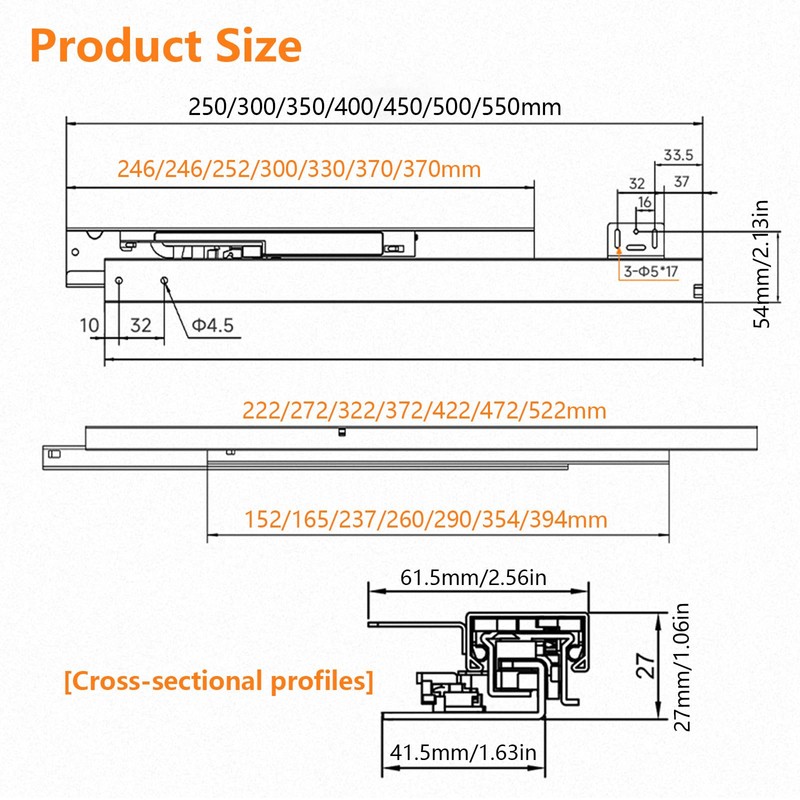 • Hidden Cabinet Drawer Slides: Bottom mount drawer slider provide a cleaner and efficient look that highlights your cabinet drawers without looking too large or bulky, not visible under the drawer track, when it is unfolded, its unfolded length is approximately equal to its length when closed