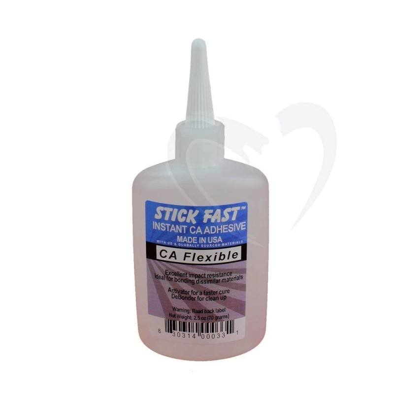 This Clear Flexible formula has the same syrupy consistency as Stick Fast's thick formula CA glue. Cures in 8-20 seconds. Unique formulation has extremely good bonding strength yet remains flexible once cured. Perfect for bonding: pen and pencil assemblies; items that must withstand high impacts without breaking; or dis-similar items like wood, metal, glass, or rubber.