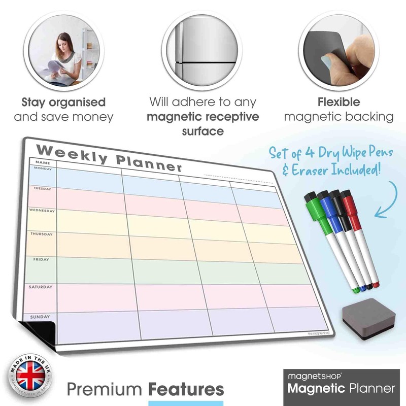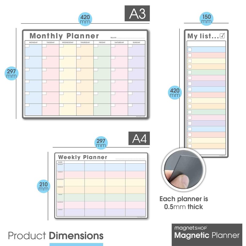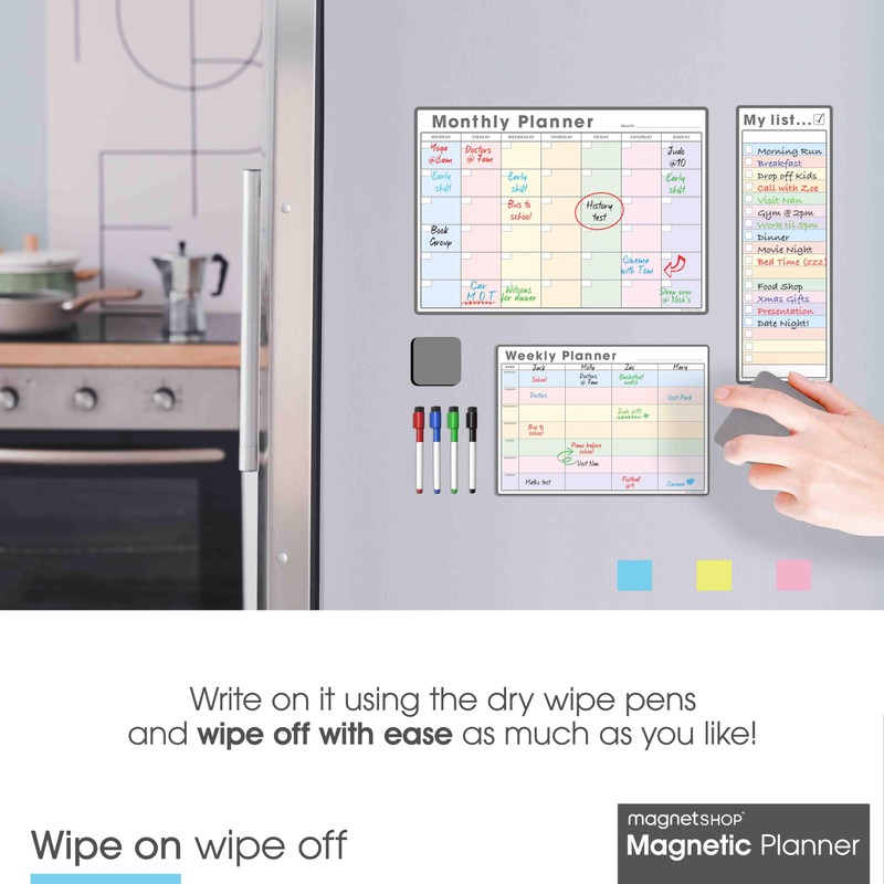 Each purchase will include an A4 Weekly Planner measuring 297mm x 210mm, an A3 Magnetic Calendar measuring 420mm x 297mm, and a slim A3 (S3) My List measuring 147mm x 420mm. You will also receive 4 dry erase pens which have a magnet and felt eraser on the end, to make tidying up minor mistakes quick and easy. The larger magnetic eraser is then great for creating a clean slate allowing you to start preparing for the week or month ahead.