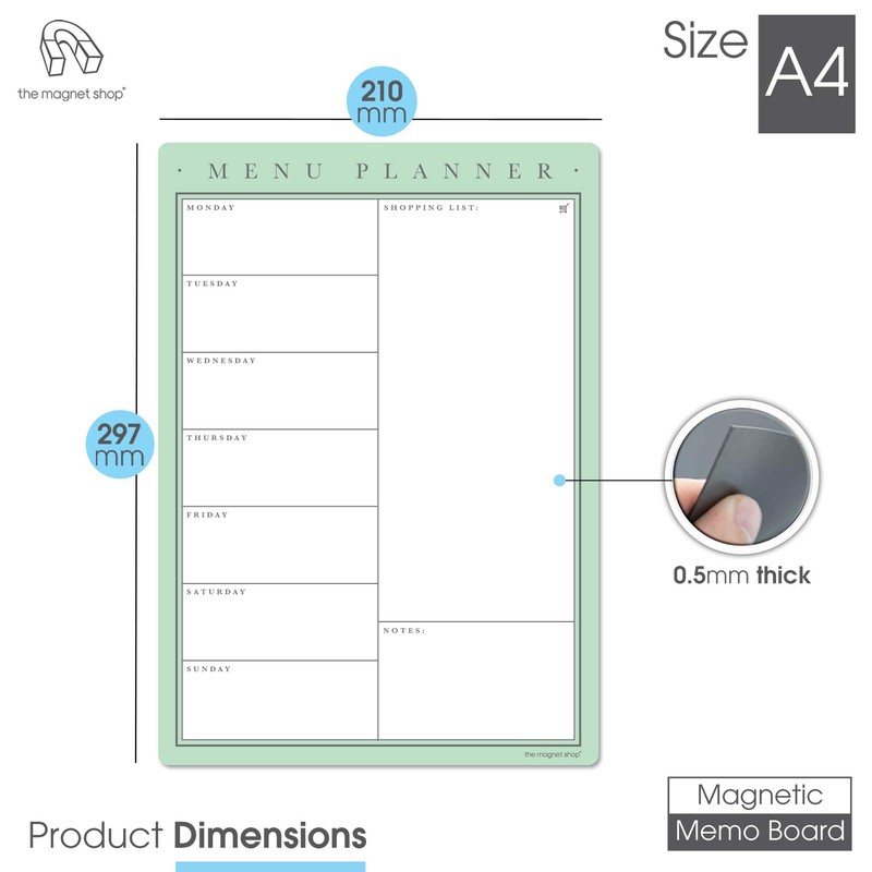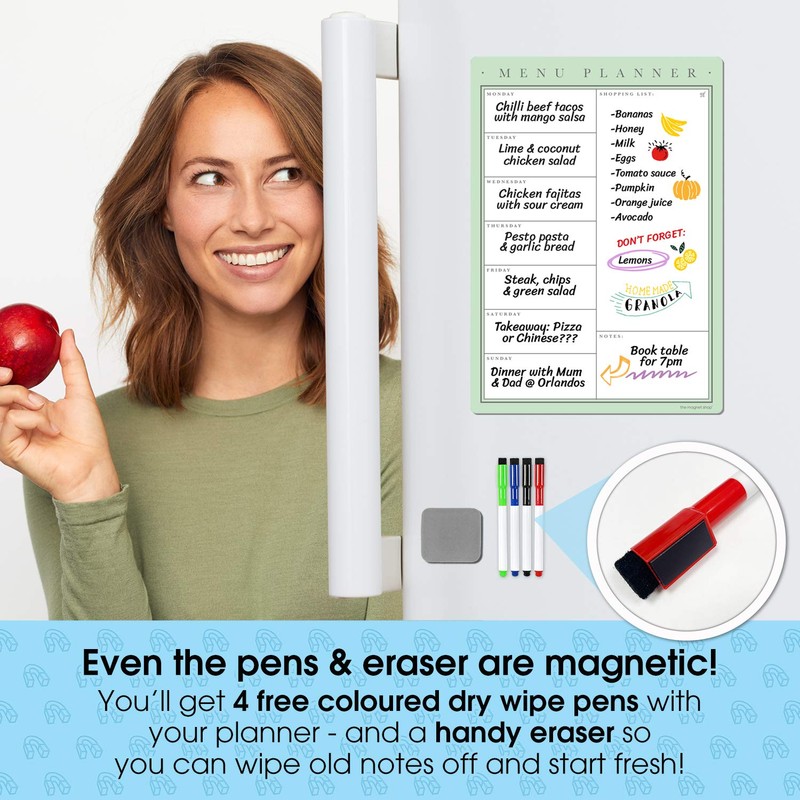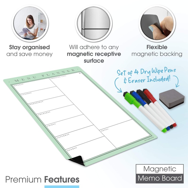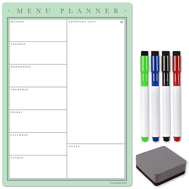 TMS Magnetic Weekly Meal Planner A4, Whiteboard Planner, Shopping List and Menu Organiser - with 4 Dry Erase Pens and Eraser Dry Wipe Fridge Calendar for Daily Notes and Reminders (Pistachio, A4)