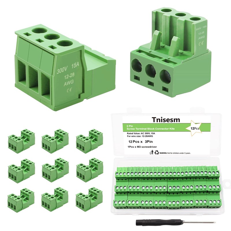 Tnisesm 12Pcs 3 Pin Screw Terminal Block Connector 5.08mm Pitch Pluggable with 3 Pin Phoenix Plug 300V 15A for 28-12AWG Cable
