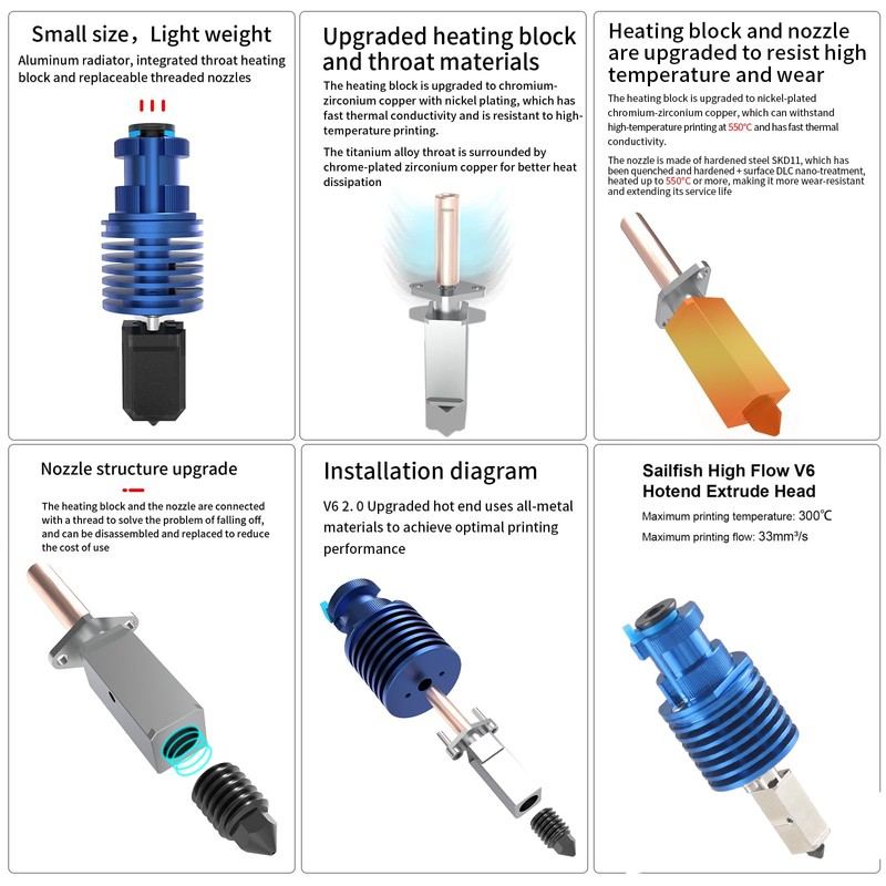 - 1. Upgrade Sailfish V6 Hot end for diy your own fdm 3d printing project or replace your stock hotend: assemble kit, apply for most popular printer model-Ender Voro0.1 CoreXY build CR10 SV06 SV07 Kobra2 Vyperr neptune3 4 plus Prusa i3 MK3S MK4 P1P X1 series