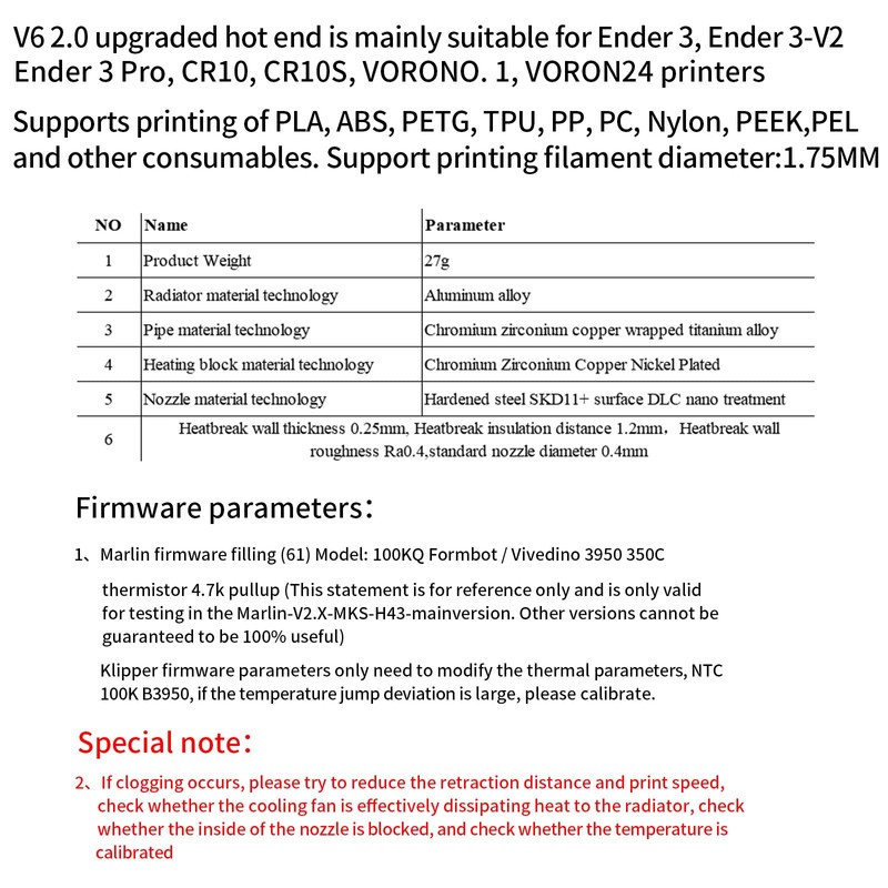 - 2. The Sailfish kit include: Heat break-aluminum alloy, Heating Block - chrome airconium copper with silicone cover, Nozzle - 0.4mm hardened steel, Thermistor - Temperature sensor NTC100K~30 ℃ - 300 ℃/ ~86-572℉, heater cartridge - temperature up to 300 ℃ 48W 24V; PTFE - 2.0, for 1.75mm filament. Also include extra themistor Terminal special for MK3S MK3S+( you need to replace it by yourself)