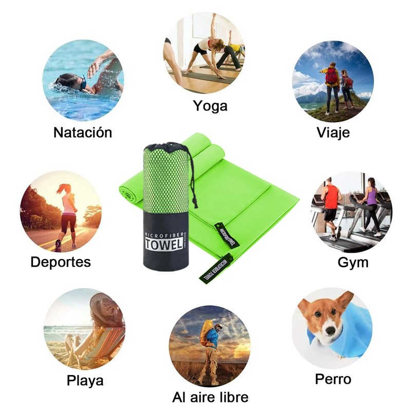 Toalla microfibra de secado rápido absorbente con funda redecilla de transporte, cierre de cordón con resorte. Súper compacta, ligera, fina y de tacto muy suave. Bordes rematados para mayor durabilidad. MATERIAL: 80% poliéster y 20% poliamida, de rápido secado (agua o sudor) y antibacteriana, evita olores desagradables. Perfecta para nadadores, a la playa, piscina, gimnasio o para viaje.