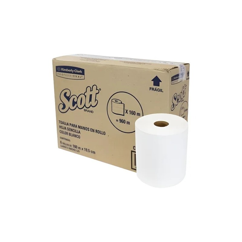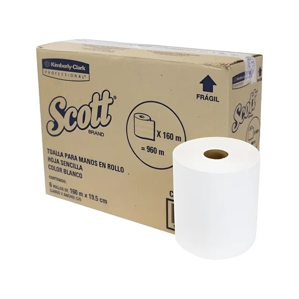 Descripción Limpia: Toalla en Rollo para Manos SCOTT. 6 Rollos de 160 mts c/u. Su centro de 2 pulgadas le permite usar la toalla en la mayoría de los despachadores del mercado. Color Blanco.