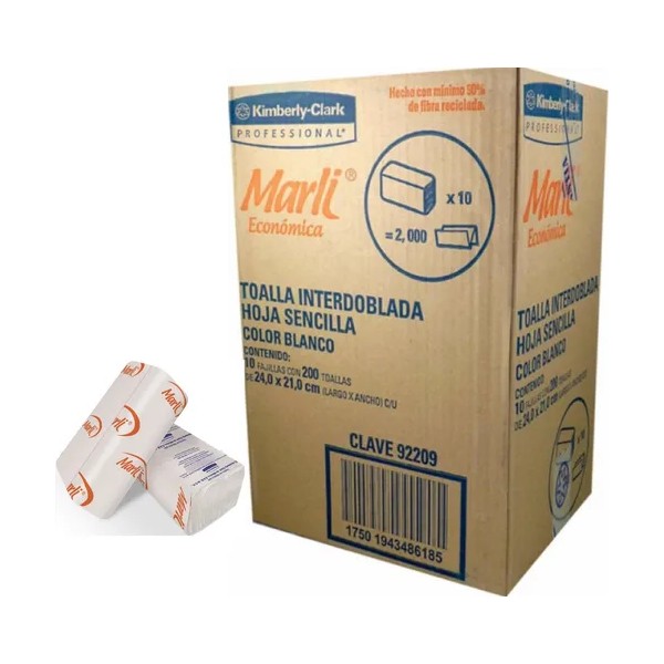 Descripción Limpia: Toalla Interdoblada Marli (Kimberly Clark) caja con 2,000 hojas