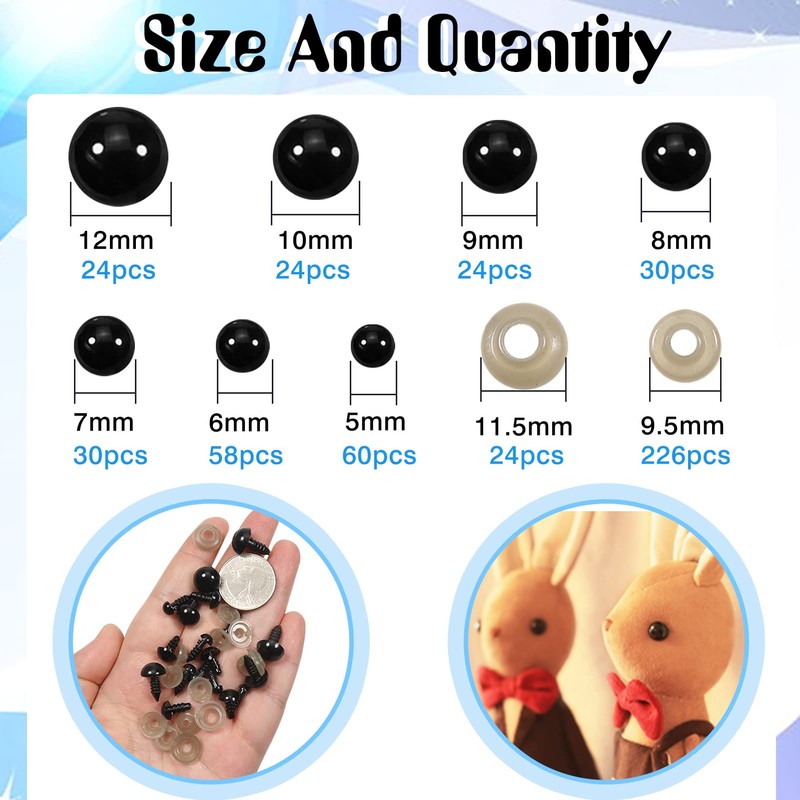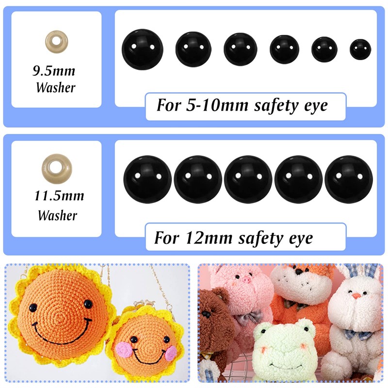 - Package include:There are 250pcs safety eyes and 250pcs washers in the package, including 5mm 60pcs;6mm 58pcs,7mm 30pcs,8mm 30pcs,9mm 24pcs,10mm 24pcs,12mm 24pcs