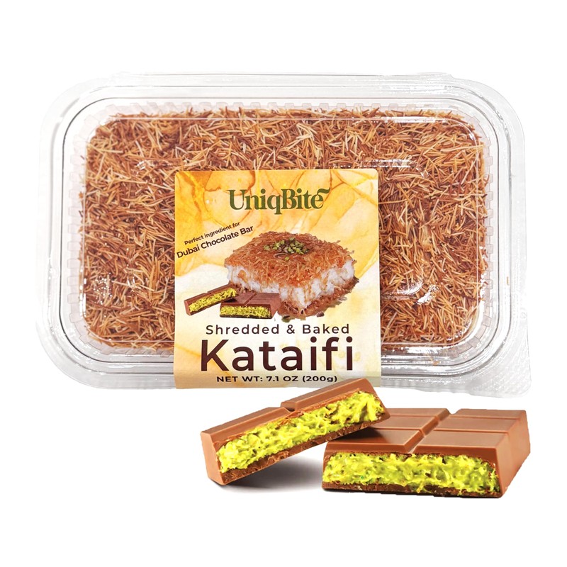 Enjoy the versatility of Uniqbite Kataifi, premium shredded fillo dough perfect for creating delicious desserts like knafeh and baklava, or even innovative treats like the viral Dubai Chocolate Bar. Made with high-quality ingredients, this 7.1 oz (200g) pack is ideal for crafting both traditional and modern pastries. Whether you're baking a classic dessert or experimenting with a new recipe, Golden Threads Kataifi adds the perfect crisp texture to elevate any dish.