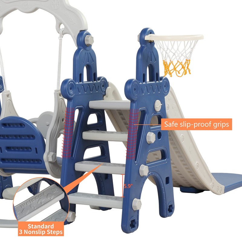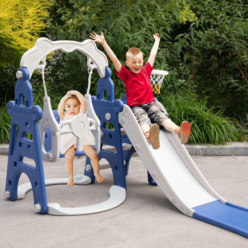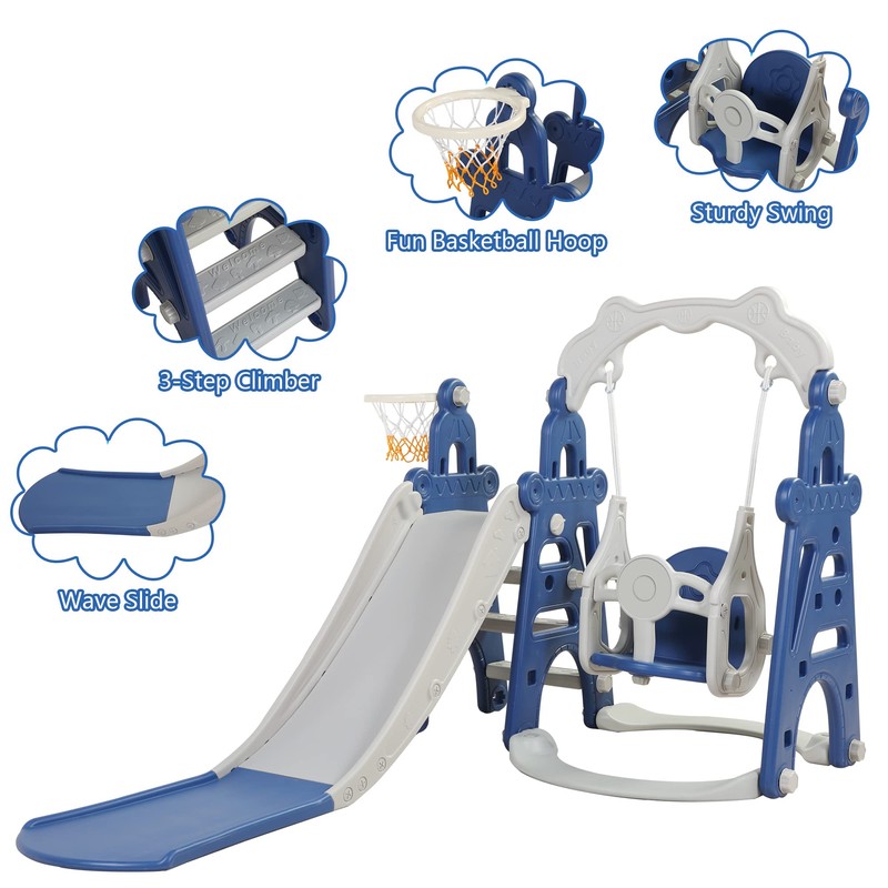 TOBBI 4 in 1 Kids Slide and Swing Set for Indoor and Outdoor, Freestanding Slide for Toddler Play Climber Slide Playset with Basketball Hoop, Blue and Grey