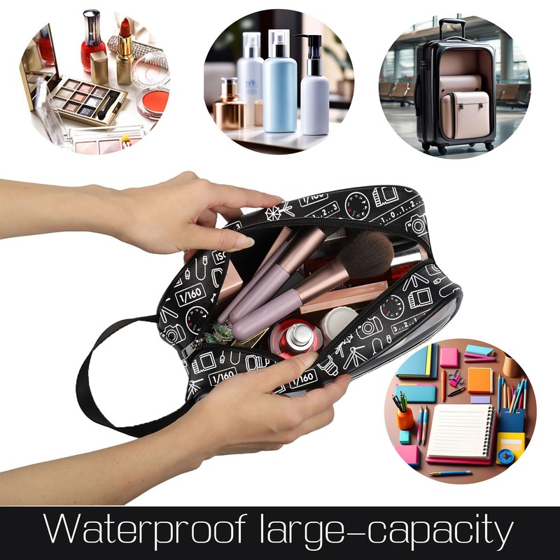 - Material: Portable Make up Bag is made of high quality Polyester material with a sturdy zipper head to ensure durability and wear resistance. Double-sided beautifully patterned printing and waterproof features make it safe and convenient to store items