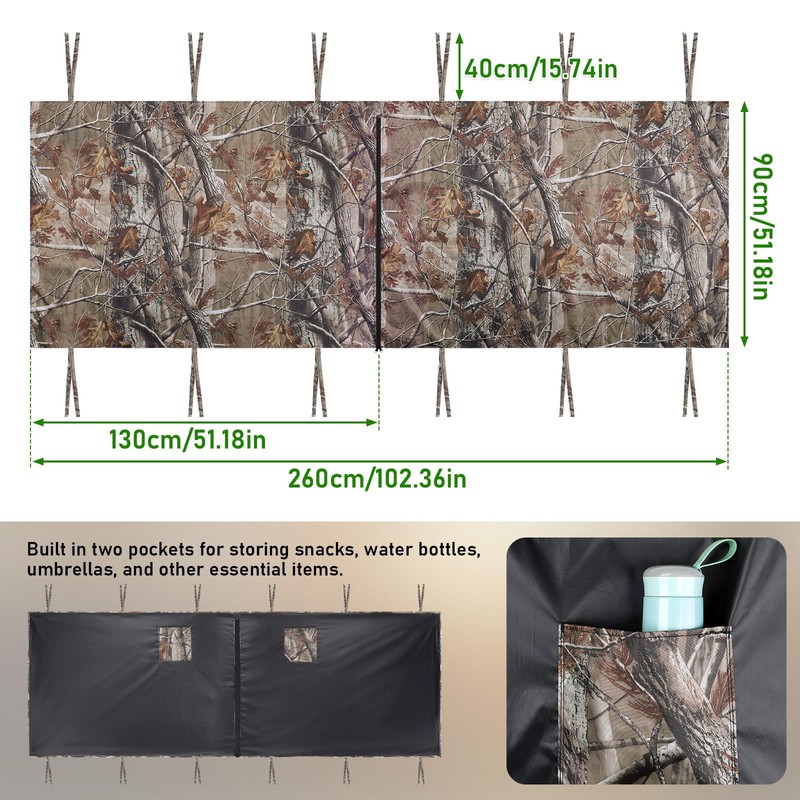 - 【Versatile and spacious design with large dimensions】-- The tree stand blind kit measures 102.4 inches × 35.5 inches (260 cm × 90 cm), providing ample space for most single-layer and double-layer tree stand seats. Its versatile design allows it to be used as a deer blind tent, hunting tent, or tree stand cover, providing hunters with essential deer hunting equipment accessories