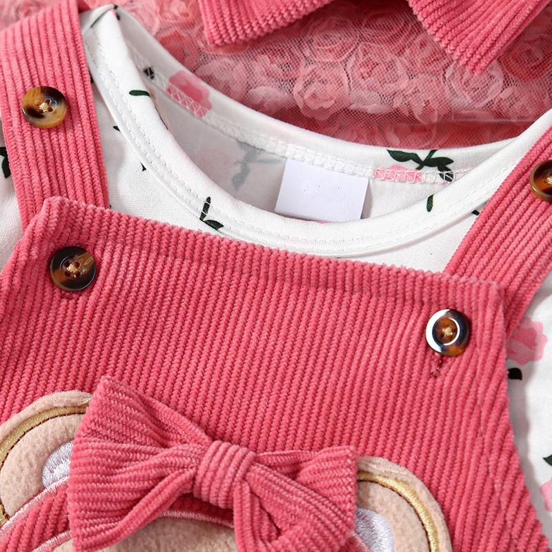 - ❤【Package Included】1x baby girls fall long sleeve floral print Romper+1x rose red bear corduroy suspender pants+1x DIY Headband.