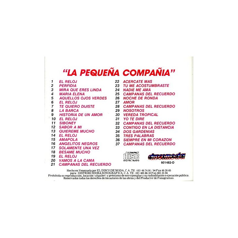 Mix 1 (20:10) 1-El Reloj 2-Perfidia 3-Mira Que Eres Linda 4-Maria Elena 5-Aquellos Ojos Verdes 6-El Reloj 7-Te Quiero Dijiste 8-La Barca 9-Historia De Un Amor 10-El Reloj 11-Siboney 12-Sabor A Mi 13-Quiereme Mucho 14-El Reloj 15-Amapola 16-Angelitos Negros 17-Solamente Un Vez 18-Besame Mucho 19-El Reloj 20-Vamos A La Cama 21-La Conga Mix 2 (14:01) 1-Me Lo Dijo Adela 2-Mi Vaca Lechera 3-Maria Cristina Me Quiere Gobernar 4-Tequila 5-La Conga 6-Salud, Dinero Y Amor 7-Cielito Lindo 8-La Pachanga 9-La Gallina Papanatas 10-La Conga 11-La Bamba 12-La Raspa 13-La Cucaracha 14-La Conga 15-Se Va El Caiman 16-Todos Queremos Mas 17-Baio De Ana 18-La Conga 19-Vamos A La Cama