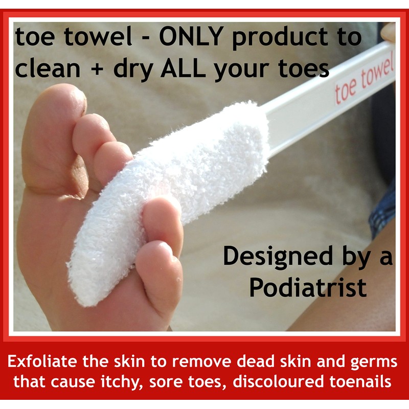 • The new Toe Towel dsigned to clean and dry between ALL YOUR TOES to remove dead skin and GERMS which cause itchy sore toes, athlete's foot and discoloured toenails!