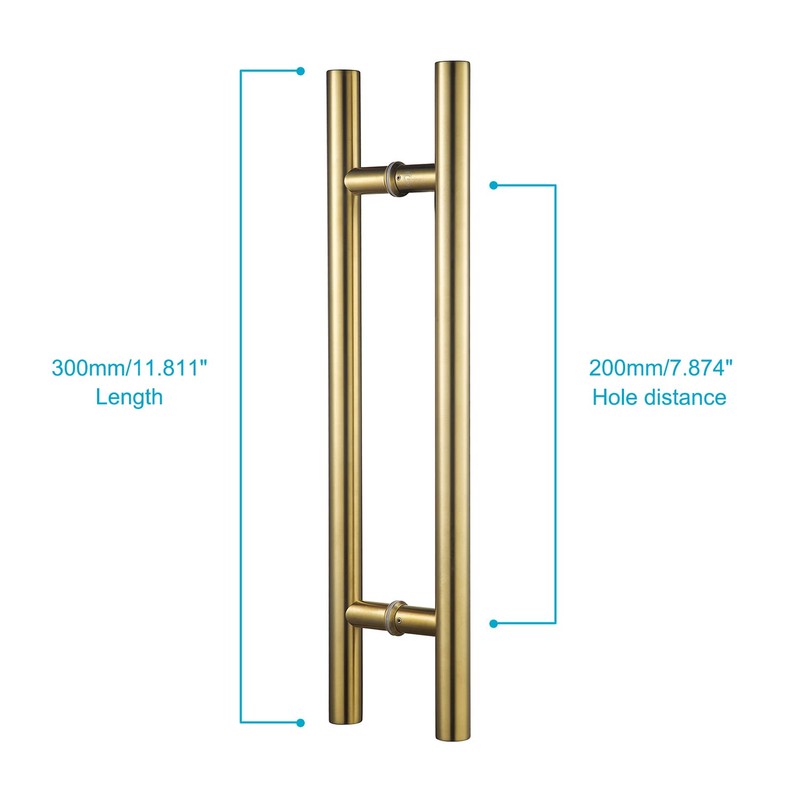• HEAVY DUTY - Finished in perfect Satin gold with chamfered edges to avoid any unexpected accidental injury, TOGU TG-6012 12 inch inch size provides a door pull/handle length of 11.81 inch /300mm, hole to hole distance 7.87 inch/200mm, Solid mounting Standoffs Height 1.65 inch /42mm, Cross-Section Diameter 0.98 inch/25mm.The Net weight of the handle is 0.95 KG/2.09LB.