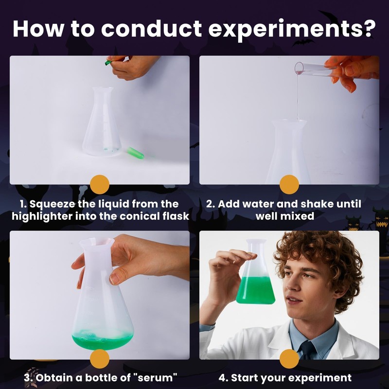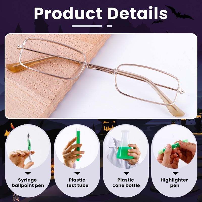 - Useful Party Props: Glasses adding a iconic touch to your ensemble, plastic flask is a realistic lab staple, perfect for carrying pretend potions or elixirs during Halloween performances. Ballpoint pen prop adds a final authentic touch, completing the look of a scientist deep in experimental chaos