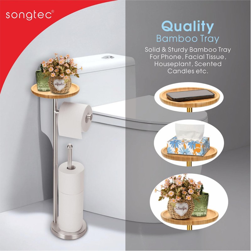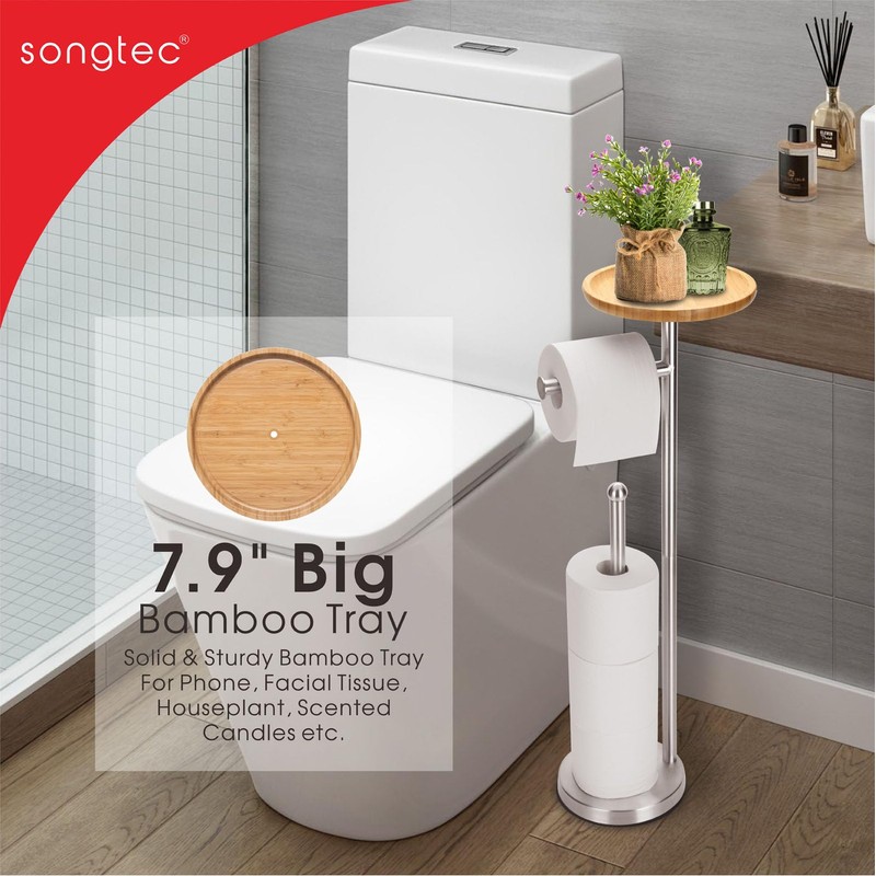 Toilet Paper Holder Stand with 7.9" Big Bamboo Tray, Holds 5 Rolls, Free Standing Paper Holder Storage Stand with Phone Shelf, Rust-Proof & Heavy Stainless Steel Base - Brushed Nickel