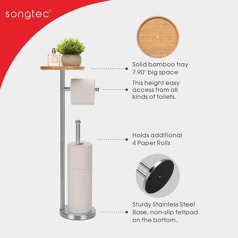 - Sturdy Base - Featuring a heavy weighted Stainless Steel base, the free standing toilet paper roll holder supports one hand push and tear, will not knock over easily. And Constructed of stainless steel ensuring durability and dependability.